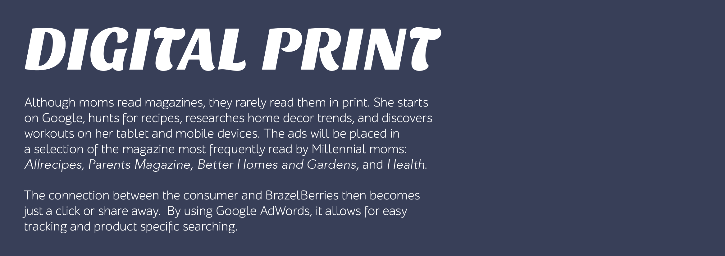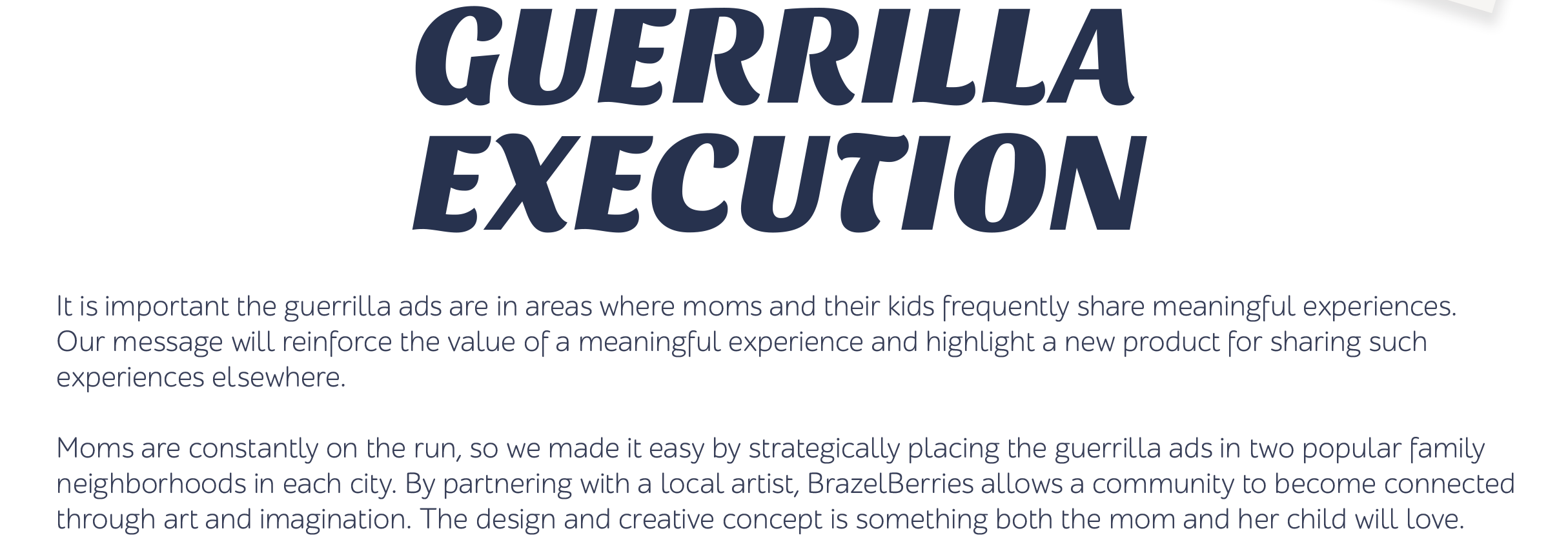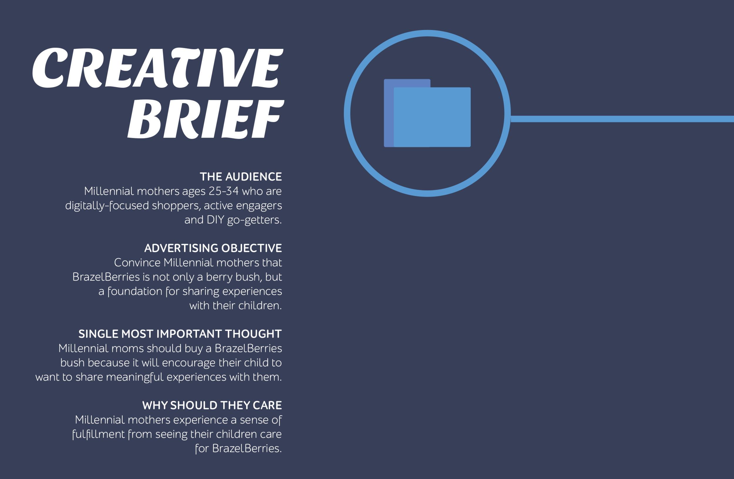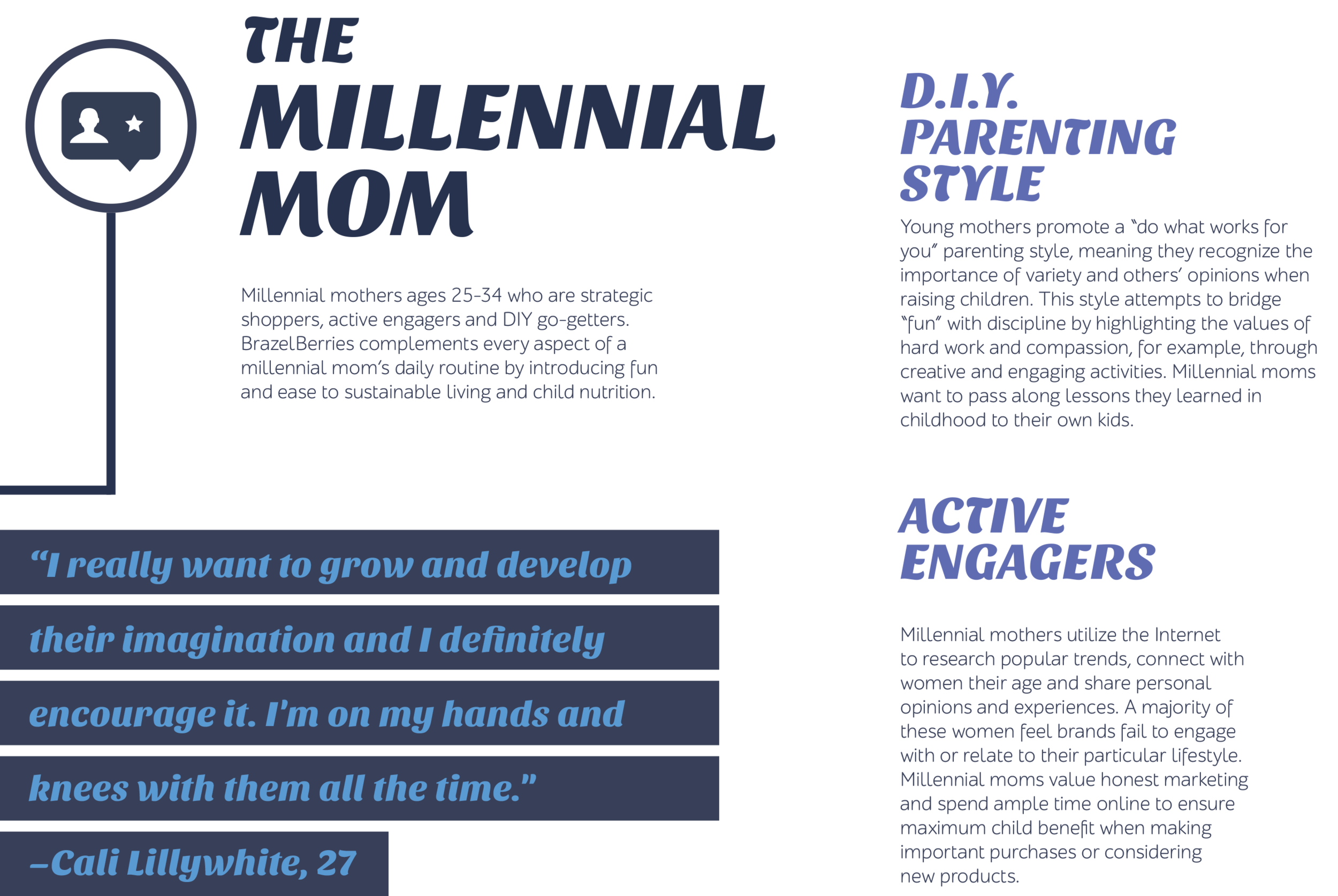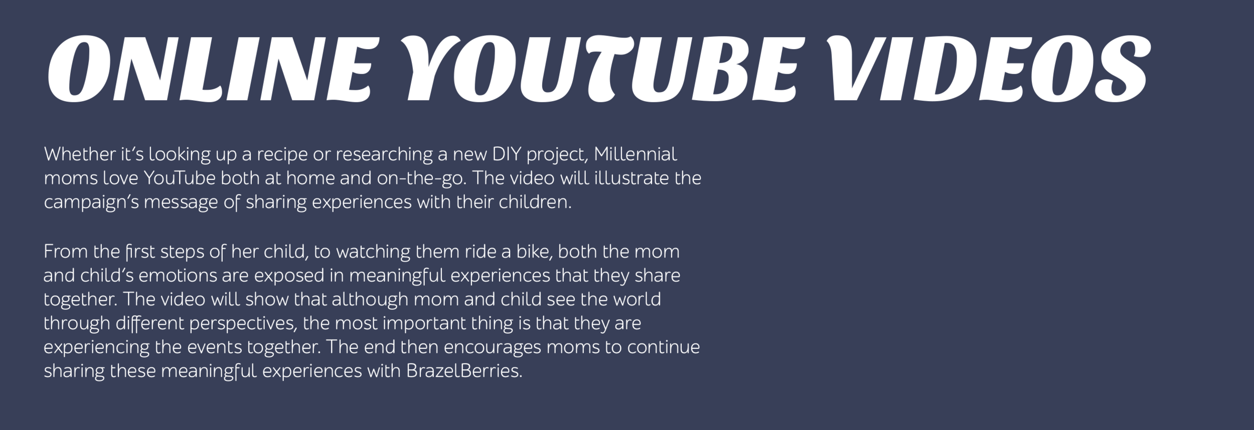 EXECUTION: Millennial Moms want to share experiences with their children. BrazelBerries gives them that opportunity. "Share in the Experience"