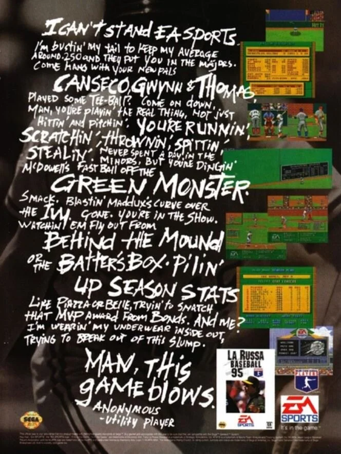 La Russa Baseball ‘95 ran a bizarre reverse psychology print ad that features an “anonymous utility infielder” bemoaning the fact that this game makes kids feel like all-stars even though they’ve never struggled through the minors. It shows off their Player’s Association rights by name dropping a bunch of good players that are in the game. Not the most clever ad and the serial killer font makes it hard to read.